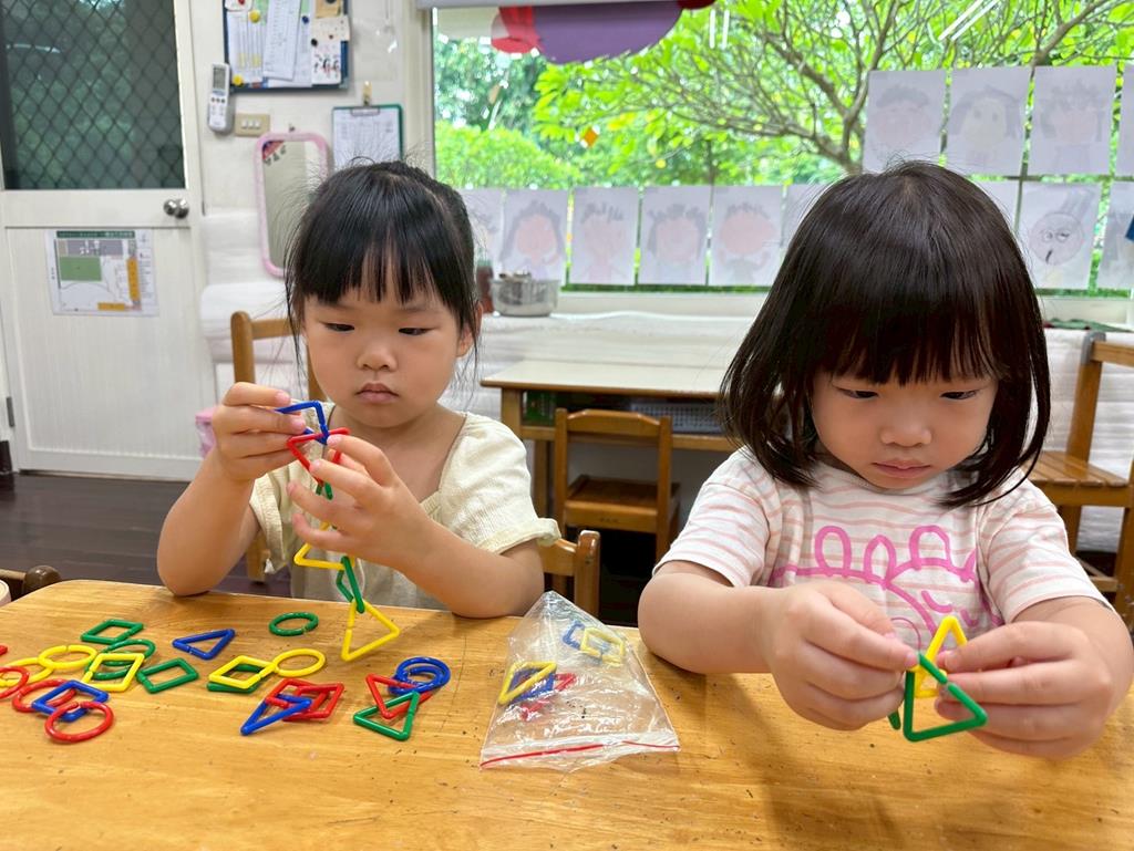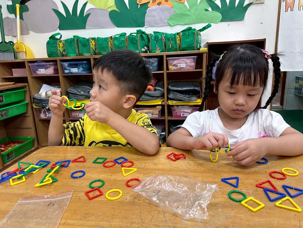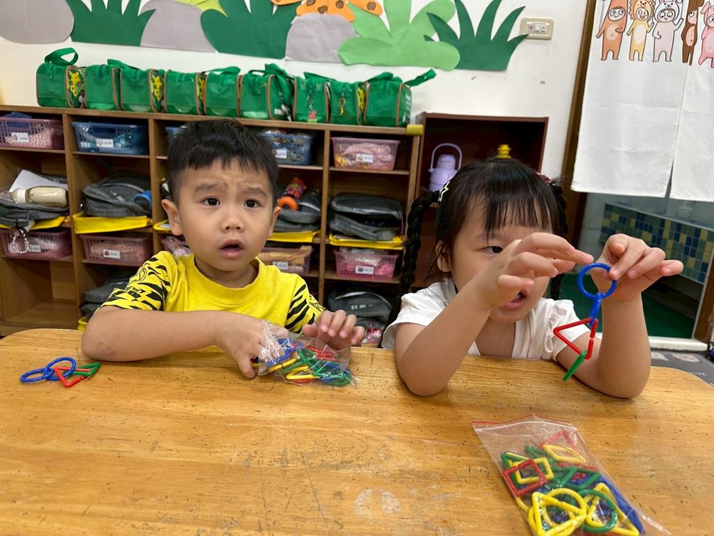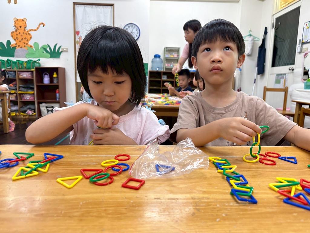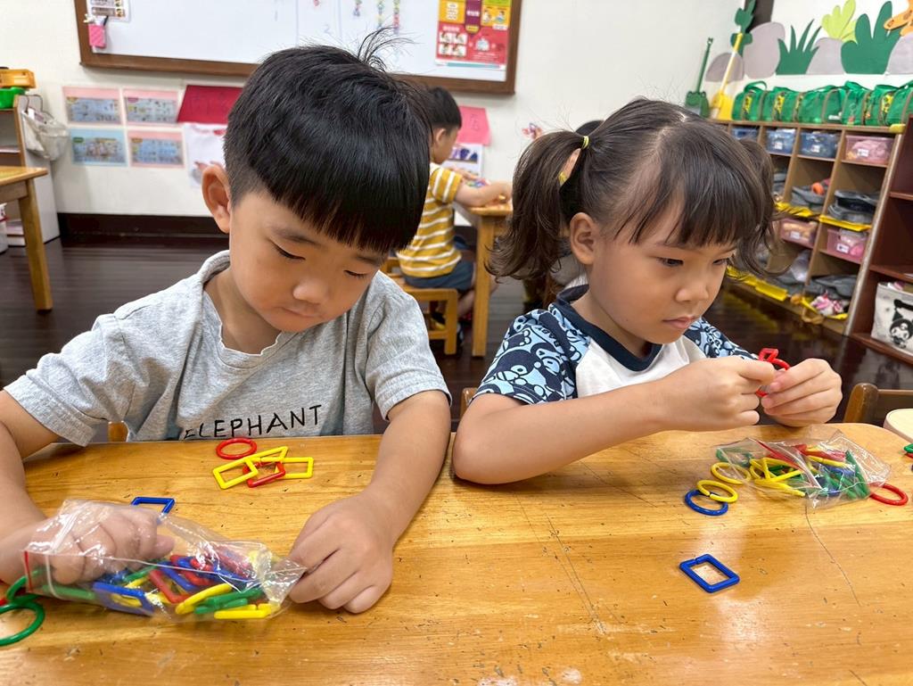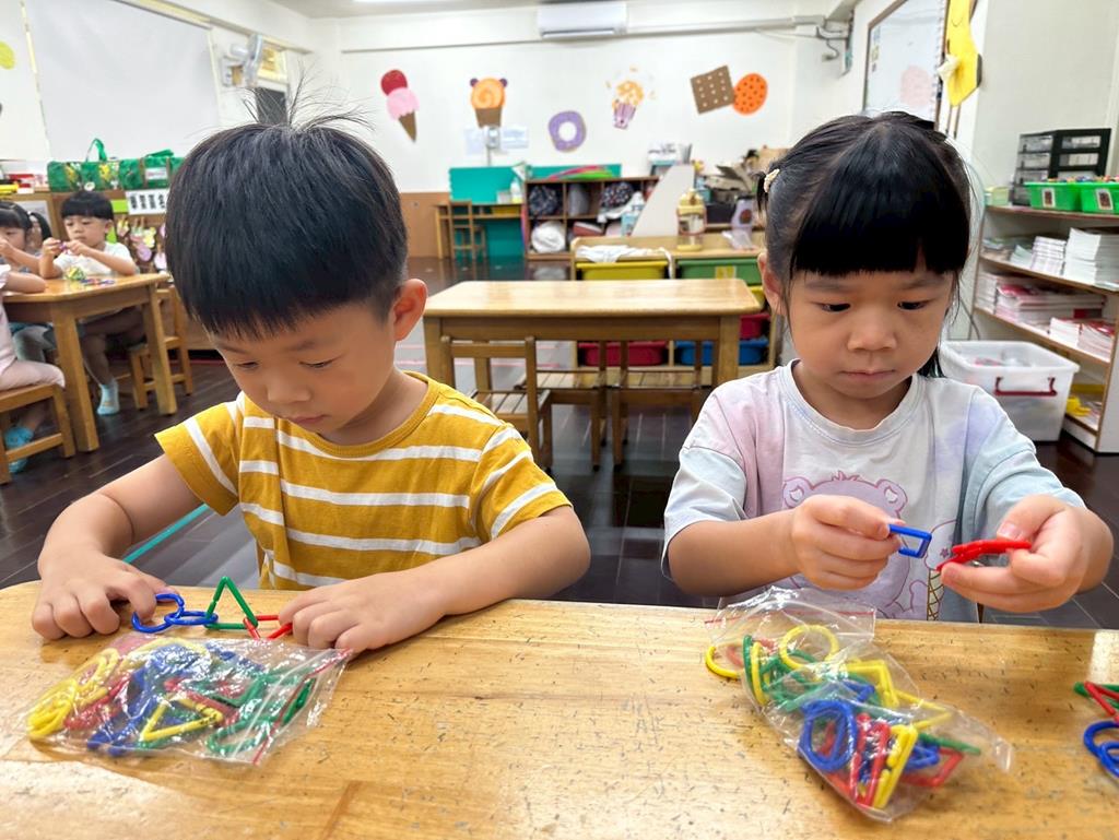 使用積木扣環進行顏色序列的練習,全部串完還可以變成漂亮的項鍊喔