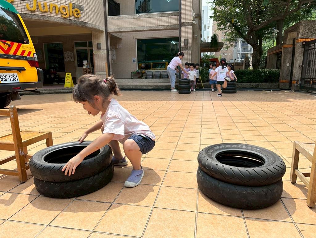 分組進行搬運輪胎並堆疊一起不倒下就過關
