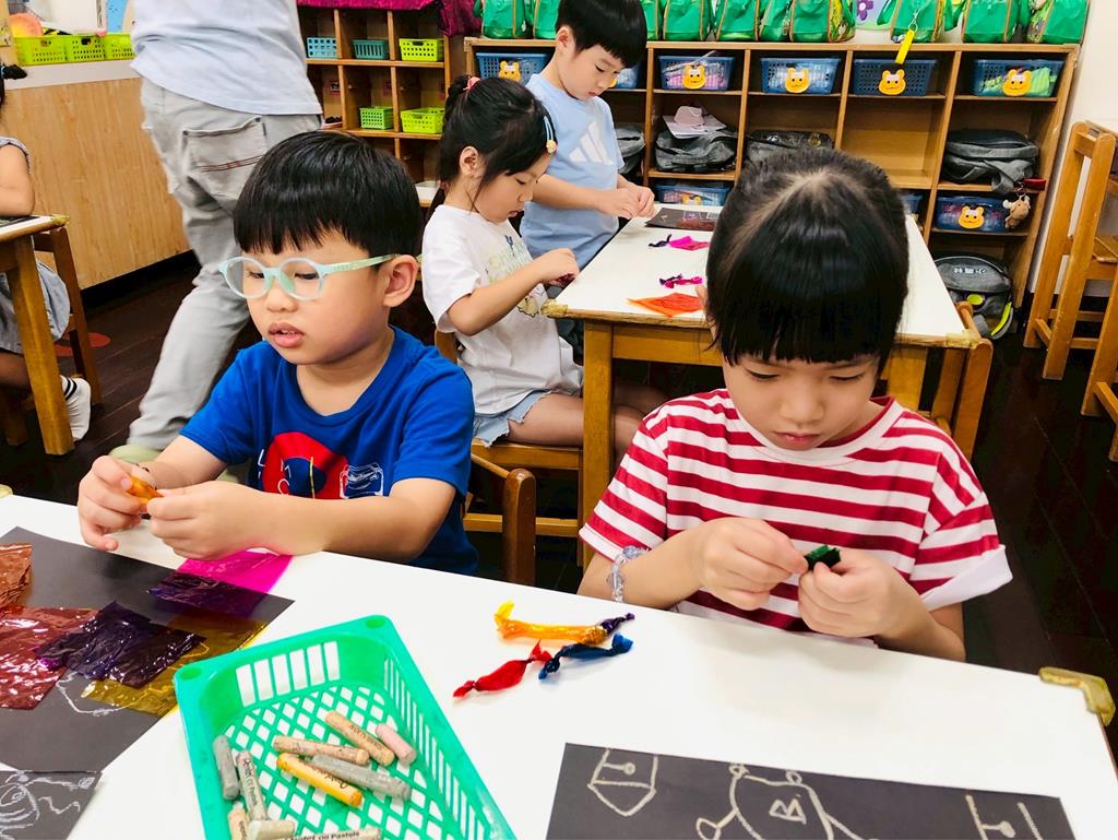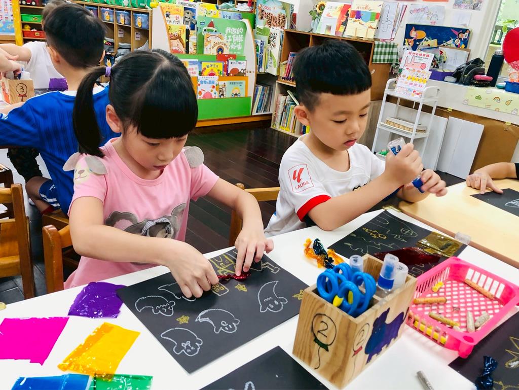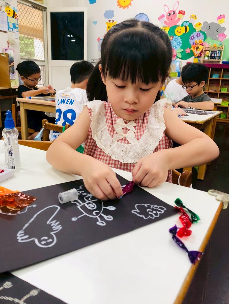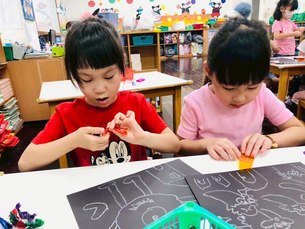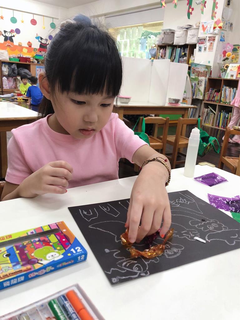 運用玻璃紙包成糖果,孩子們再畫上不同的妖怪