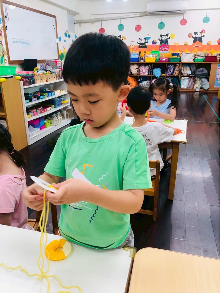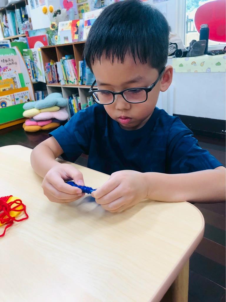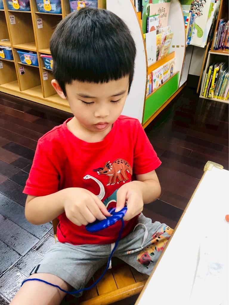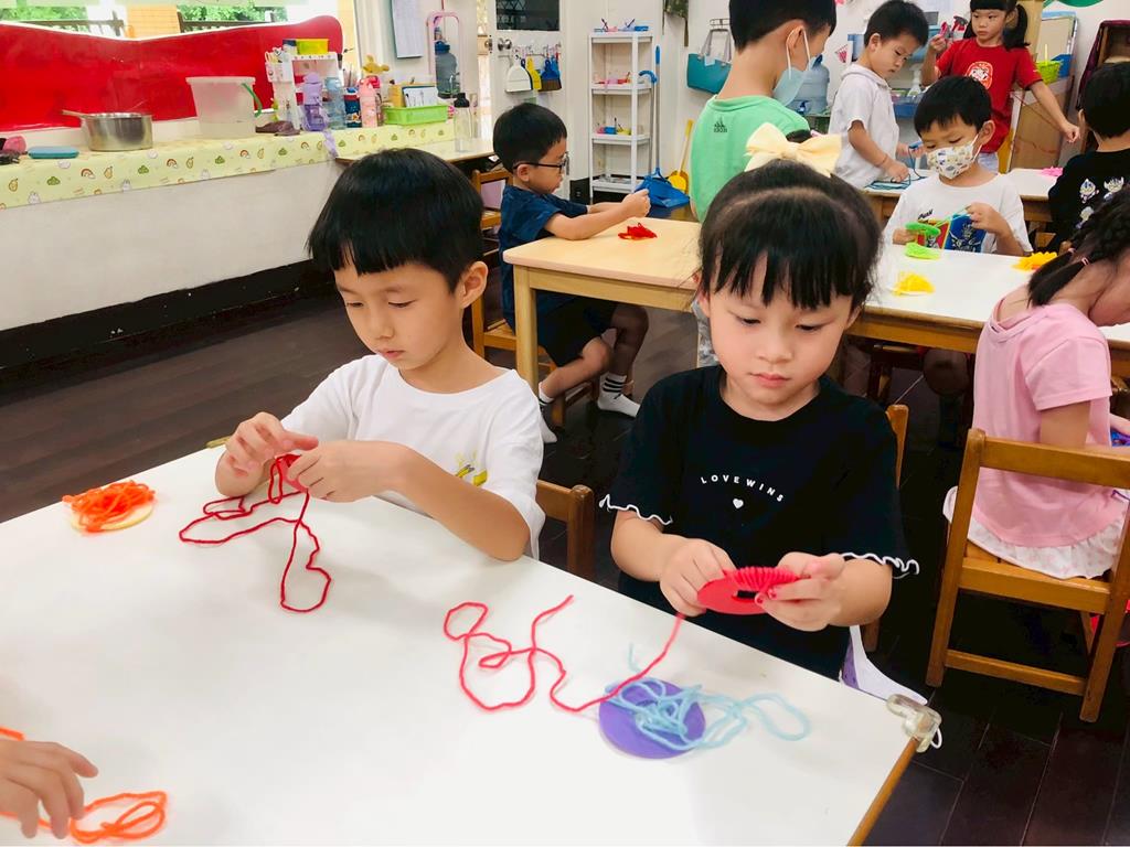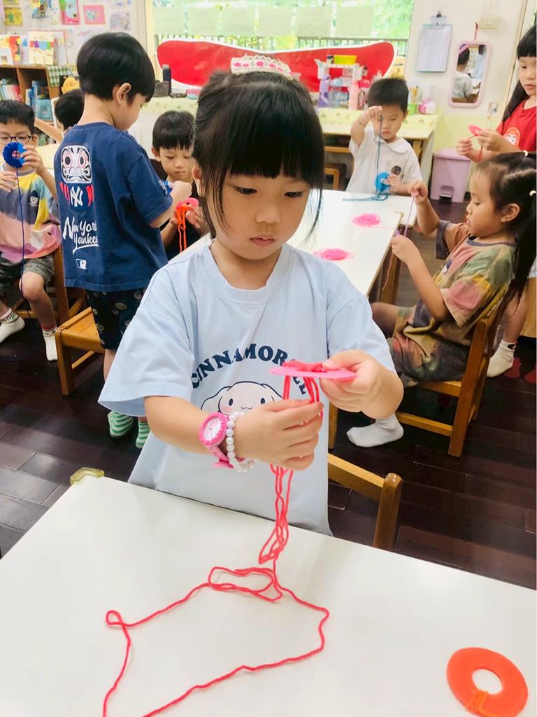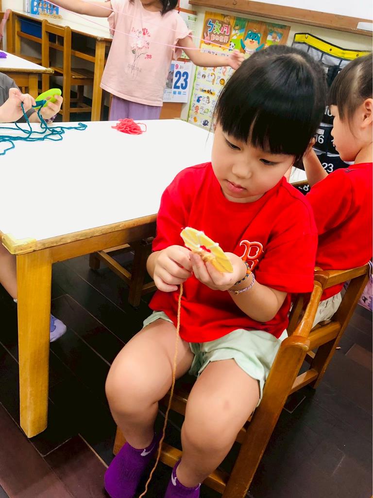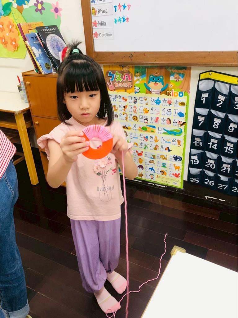孩子運用毛線將甜甜圈繞起來,著實花了一些時間哦...