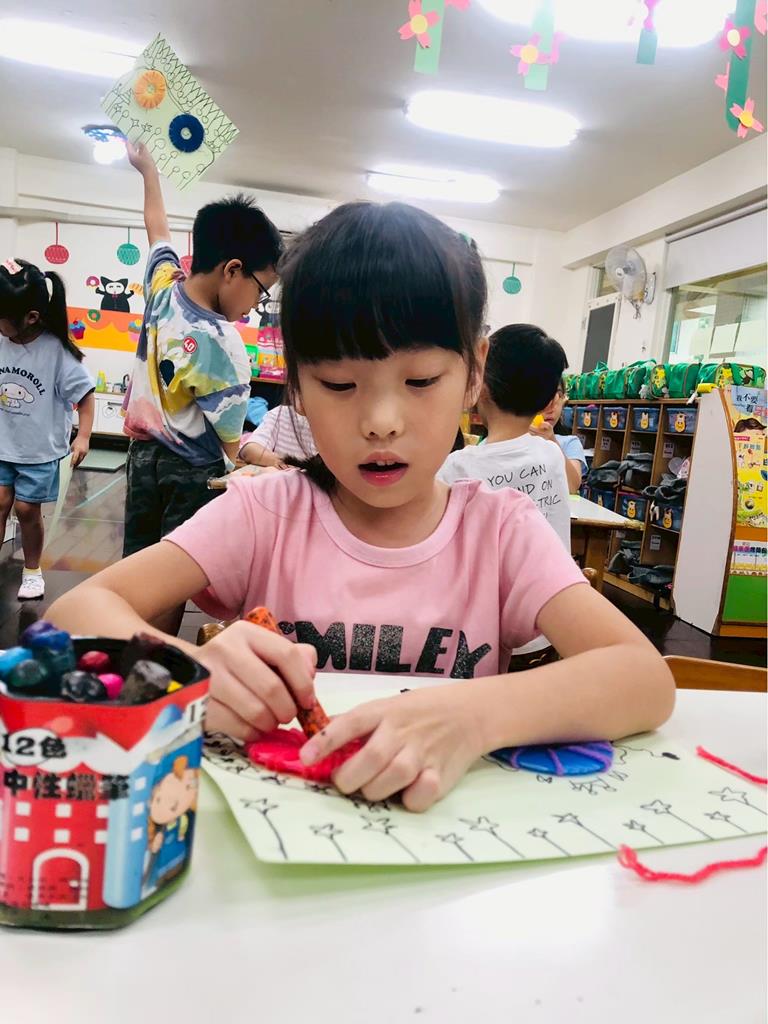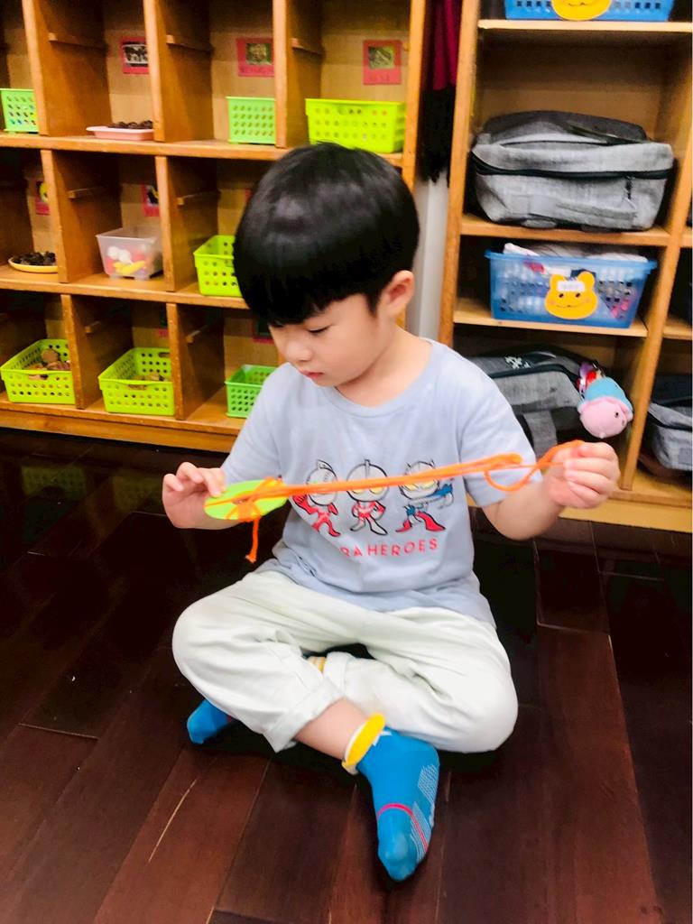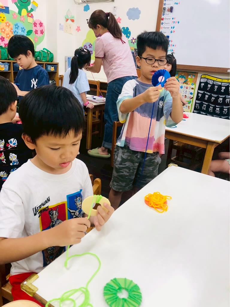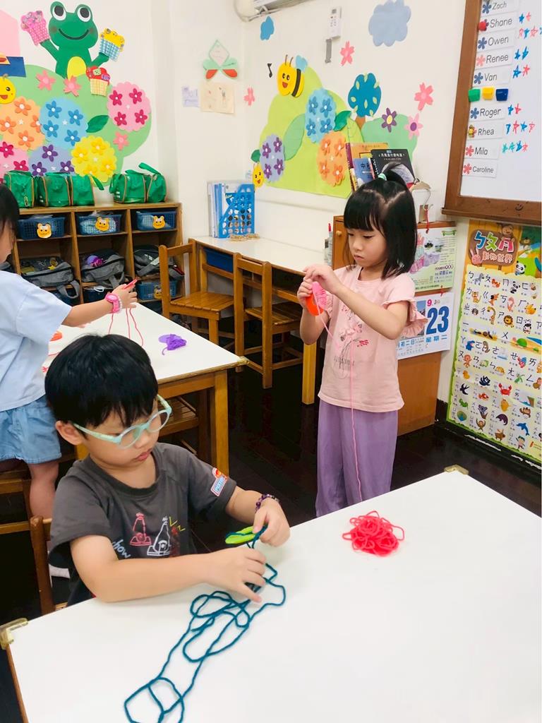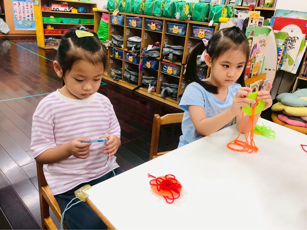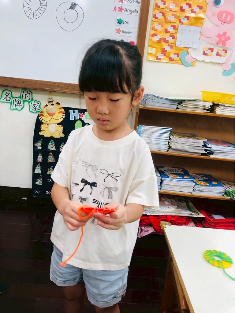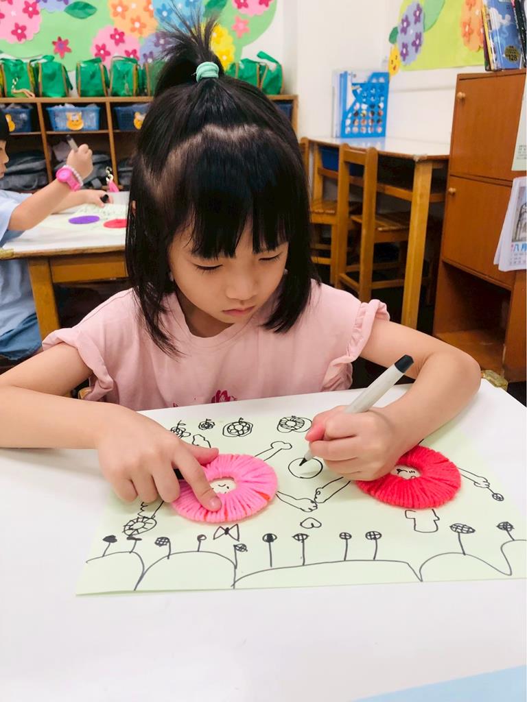 孩子運用毛線將甜甜圈繞起來,著實花了一些時間哦...