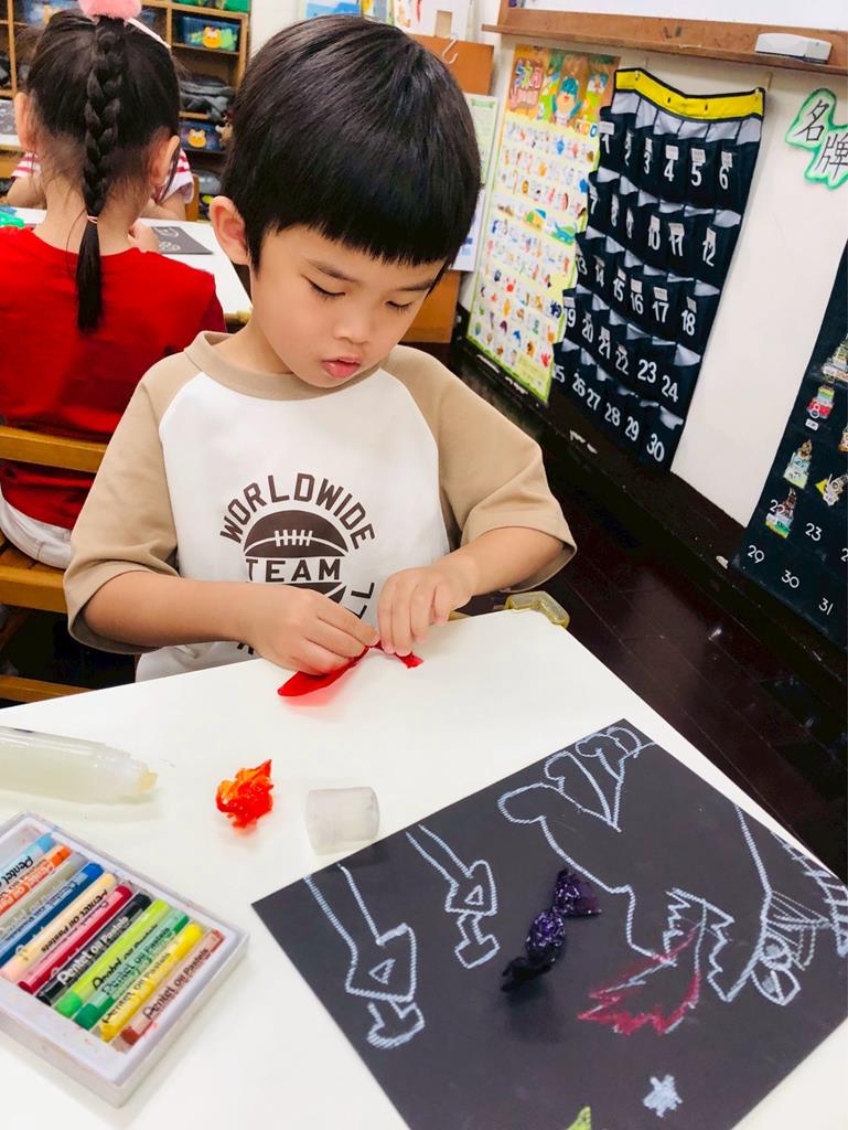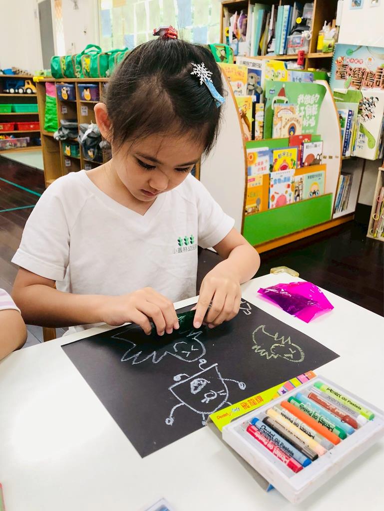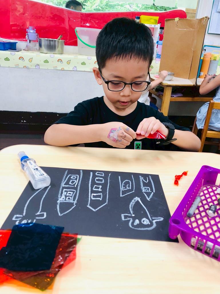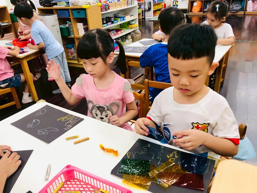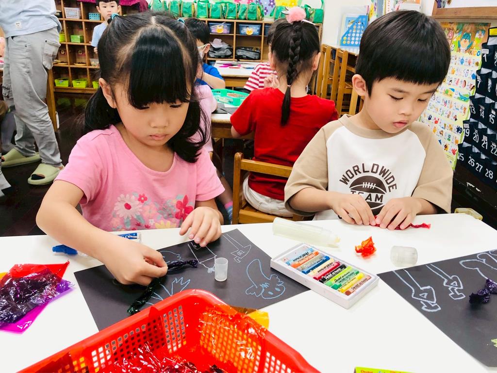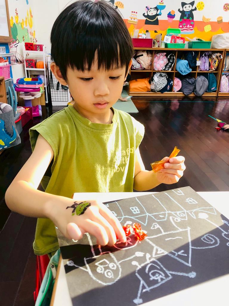 運用玻璃紙包成糖果,孩子們再畫上不同的妖怪