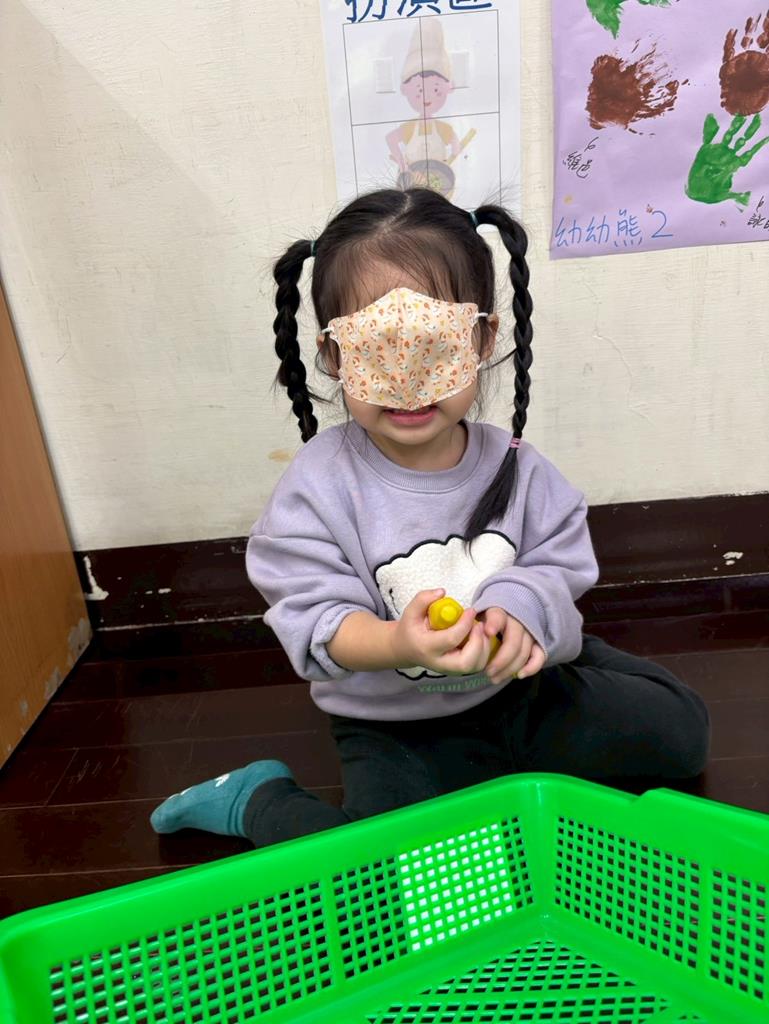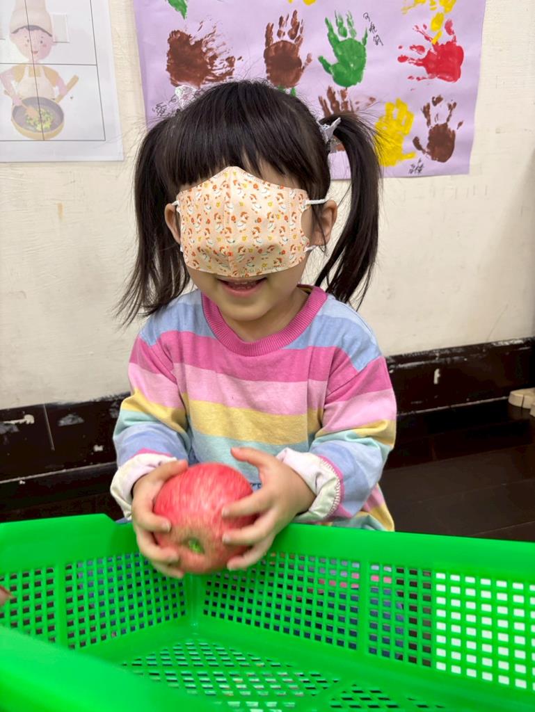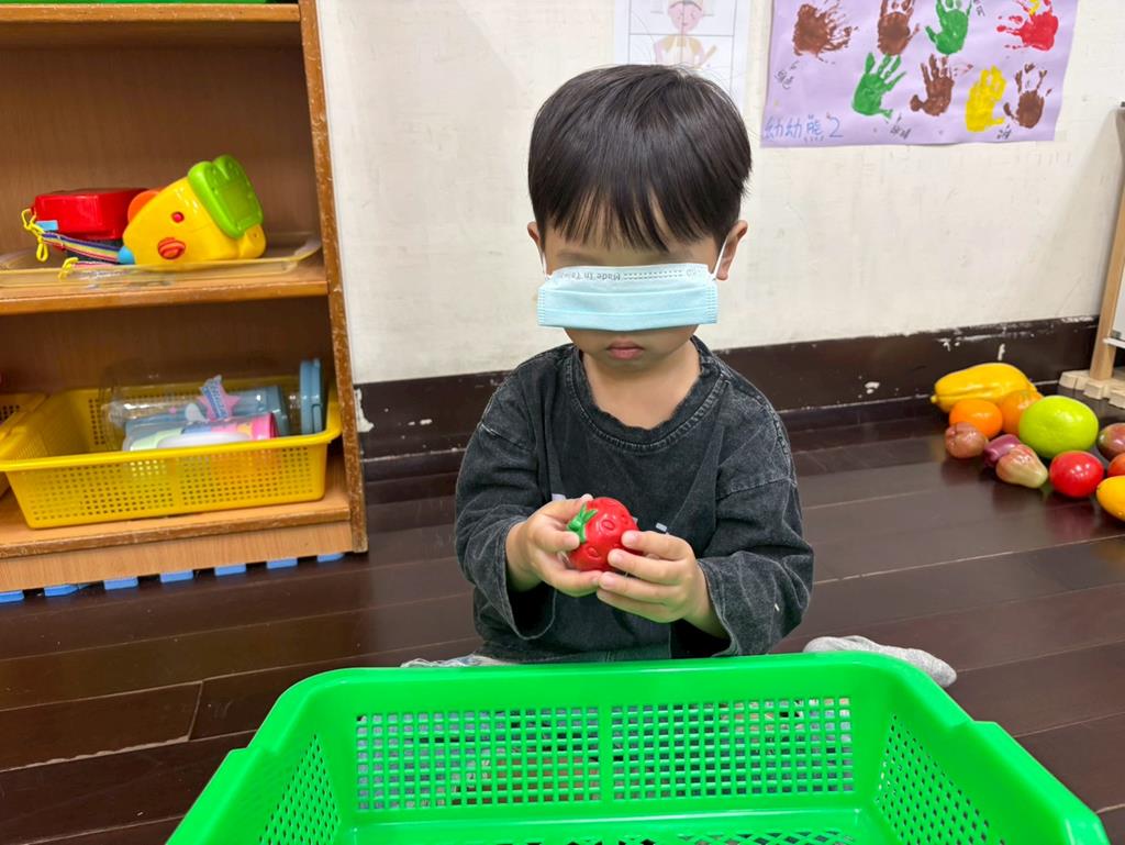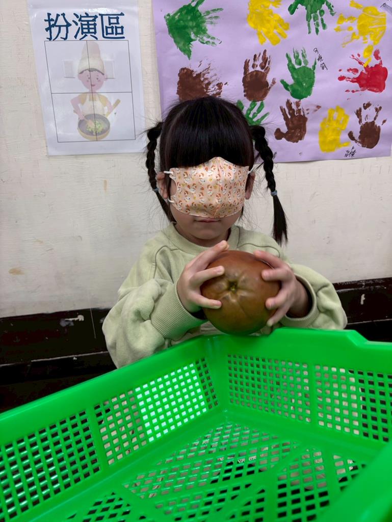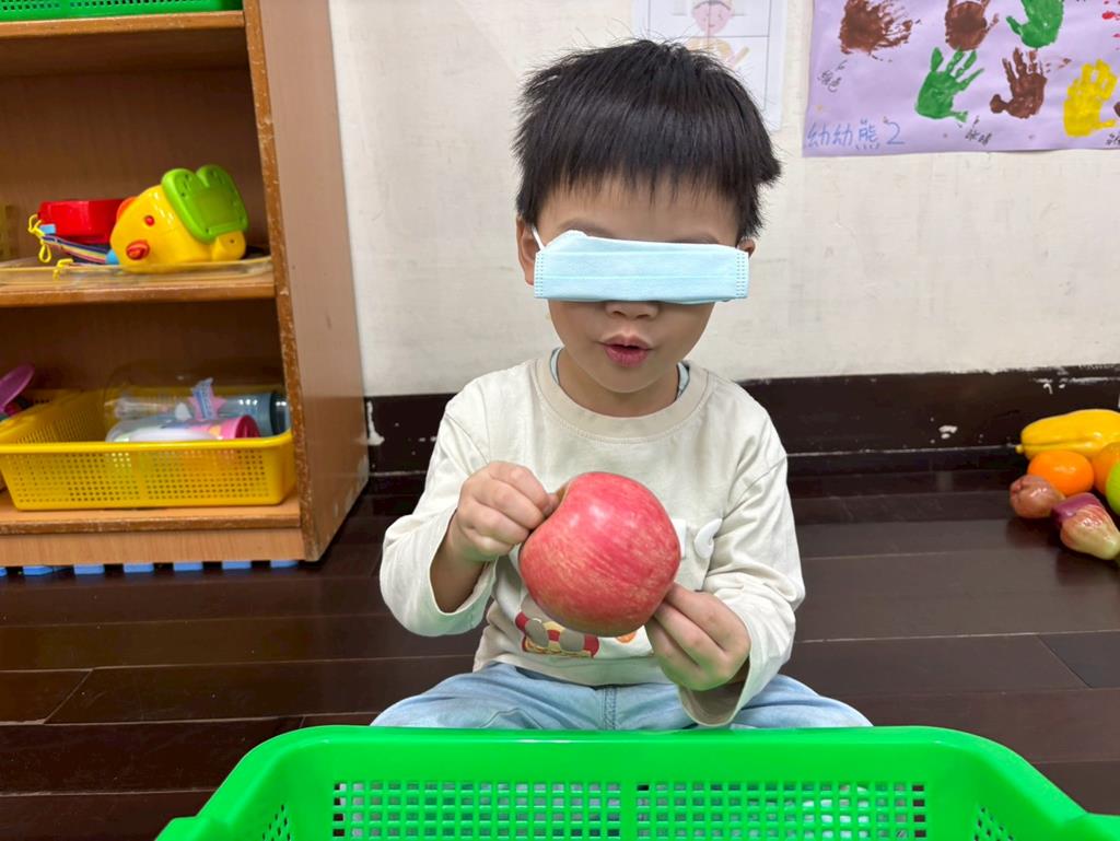 用乾淨口罩遮住眼睛,用手去摸摸看水果模型的特徵。